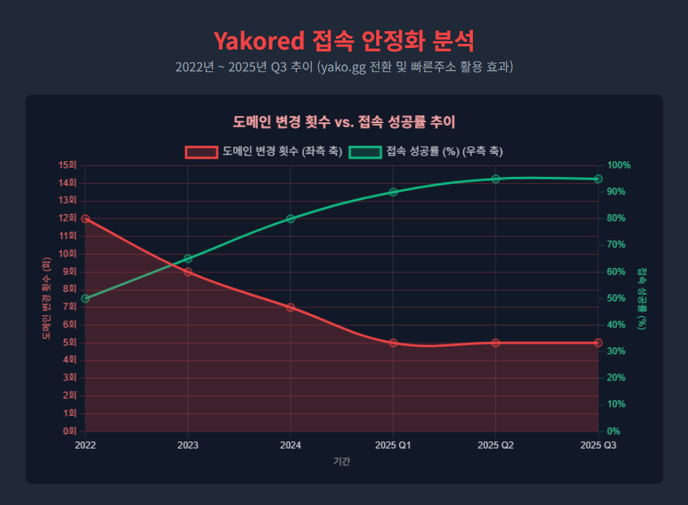 이 선 그래프는 2022년부터 2025년 Q3까지 야코레드 도메인 변경 횟수(빨간 선)와 접속 성공률(초록 선)을 나타냅니다. yako.gg로 전환 후 변경 횟수가 5회로 줄고, 빠른주소 활용으로 성공률이 95%로 상승하며 안정화된 점을 보여줍니다.